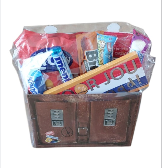 geslaagd schooltas gevuld met Reep Chips en snoep
